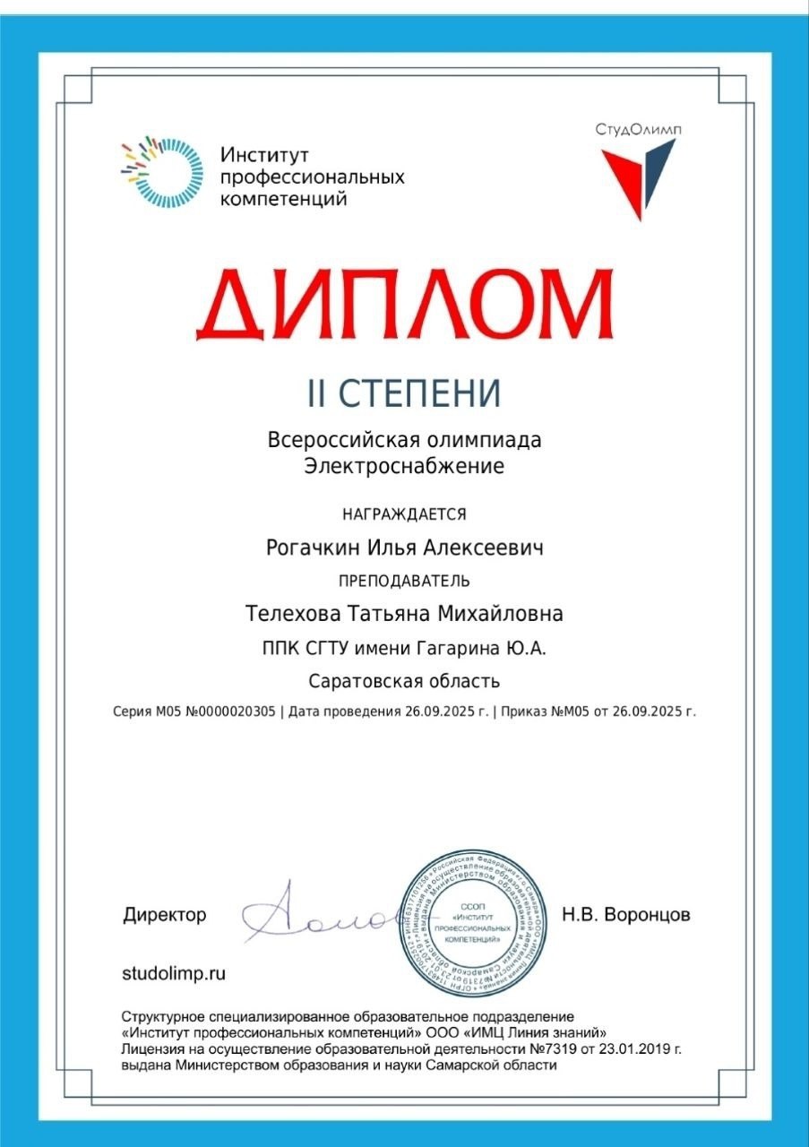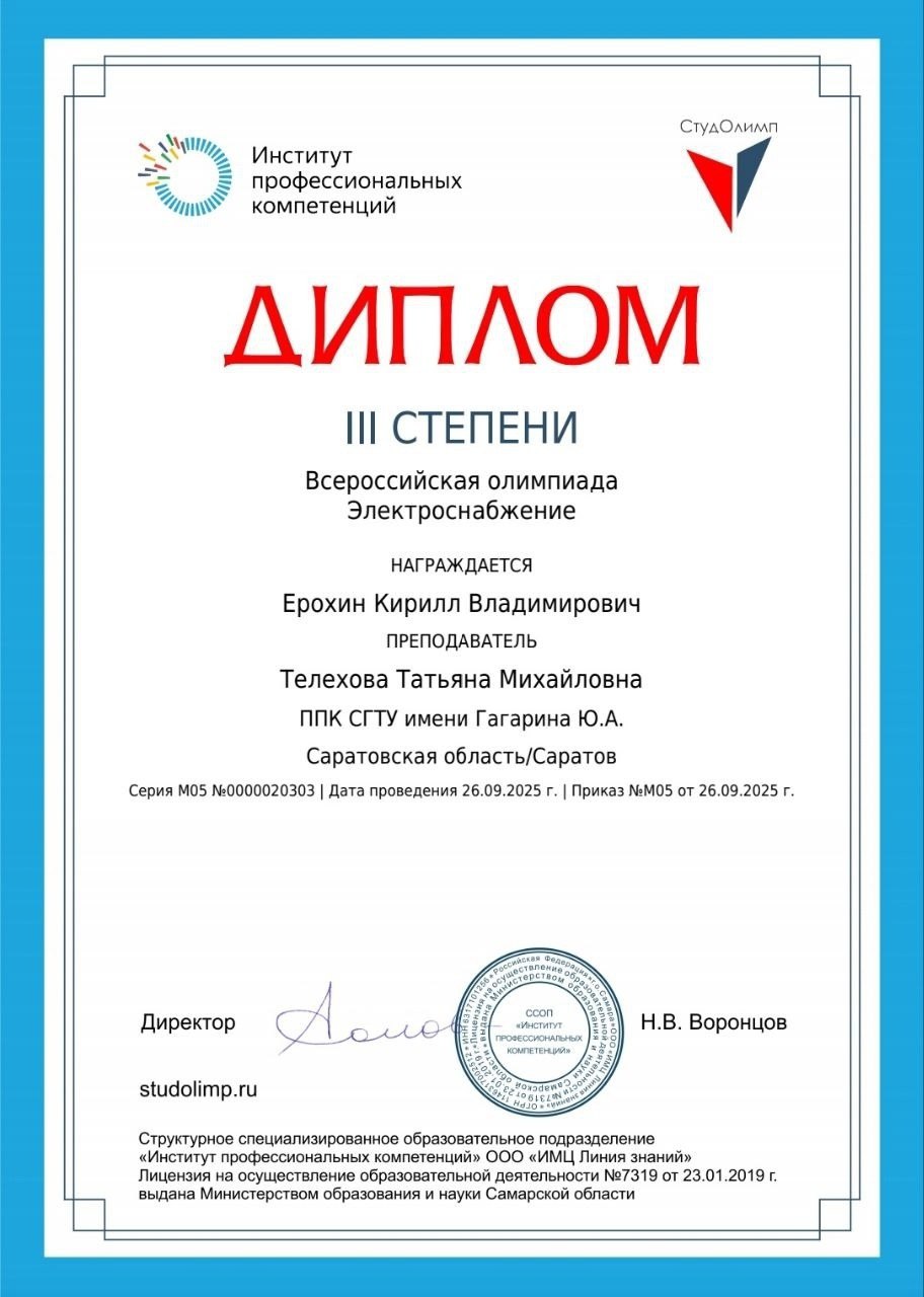 26 сентября студенты группы ЭСН-931 заняли призовые места на Всероссийской олимпиаде по энергоснабжению: