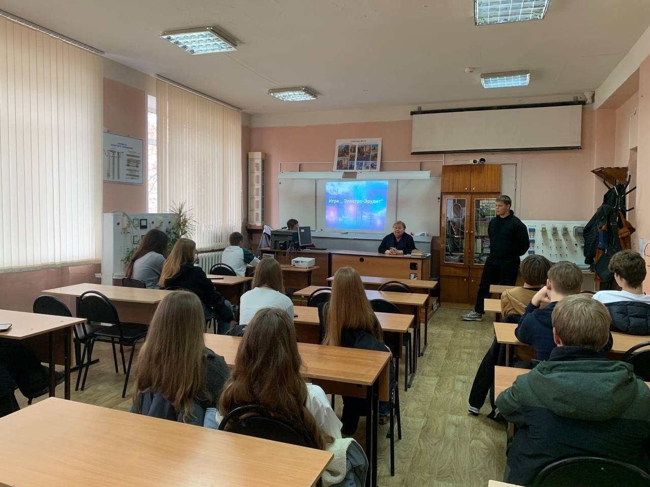 Девятиклассники из МОУ «СОШ № 84» познакомились с историей Колледжа и специальностями отделения. Преподаватель Татьяна Леонидовна Краснокутская рассказала о правилах поступления и студенческой жизни, а Христачева Ирина Германовна, Дмитриева Елена Николаевна и Зенина Татьяна Владимировна провели игру «Электро-Эрудит» и экскурсию по специальности «Управление качеством процессов и услуг».