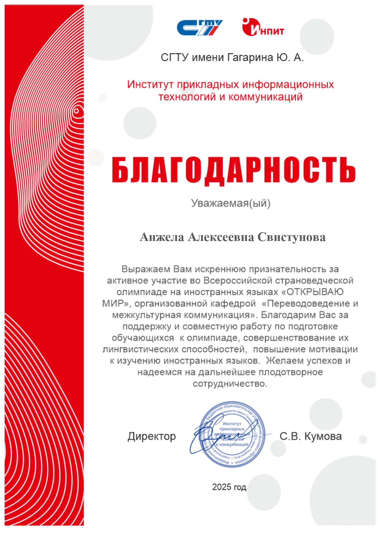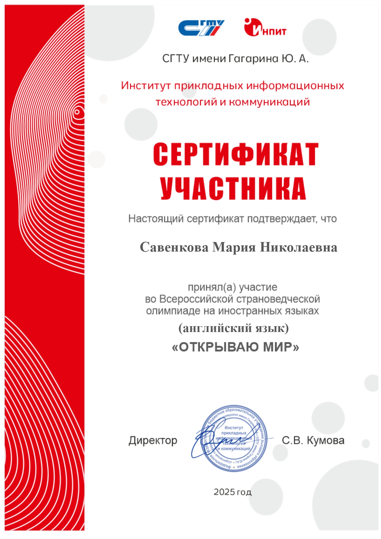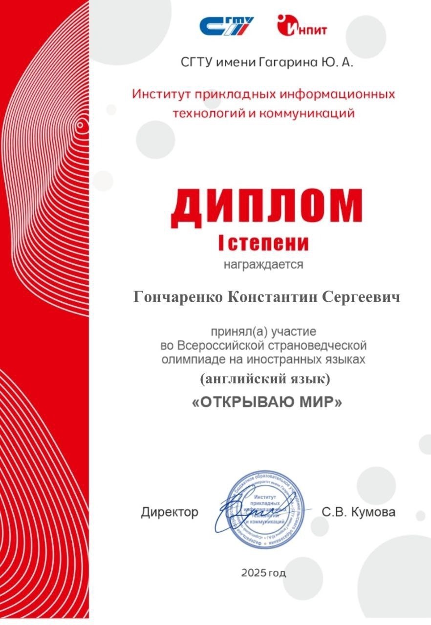 Константин принял участие во Всероссийской страноведческой олимпиаде на иностранных языках «Открываю мир» и завоевал 1 место!