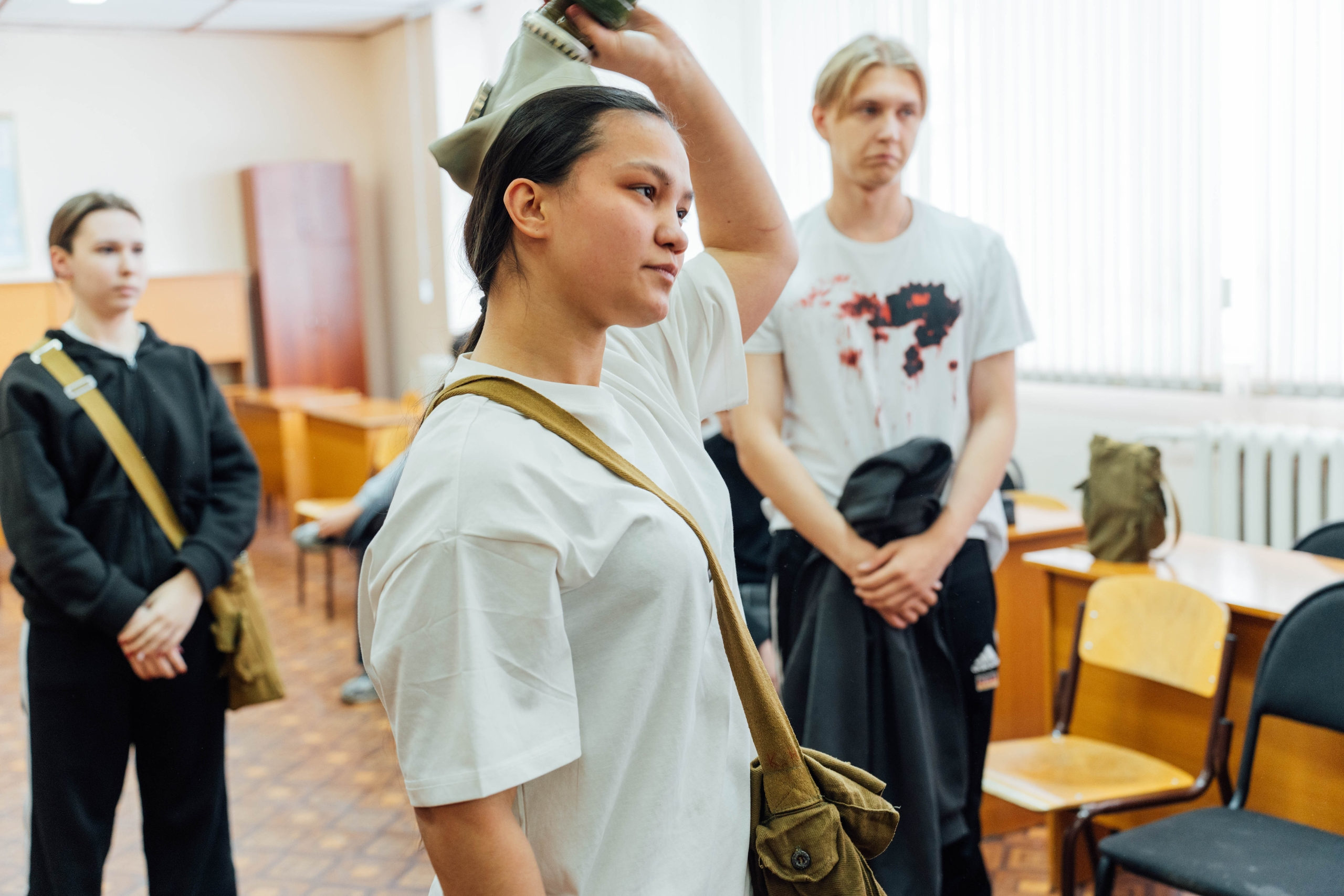 🔹 Надевание фильтрующего противогаза;