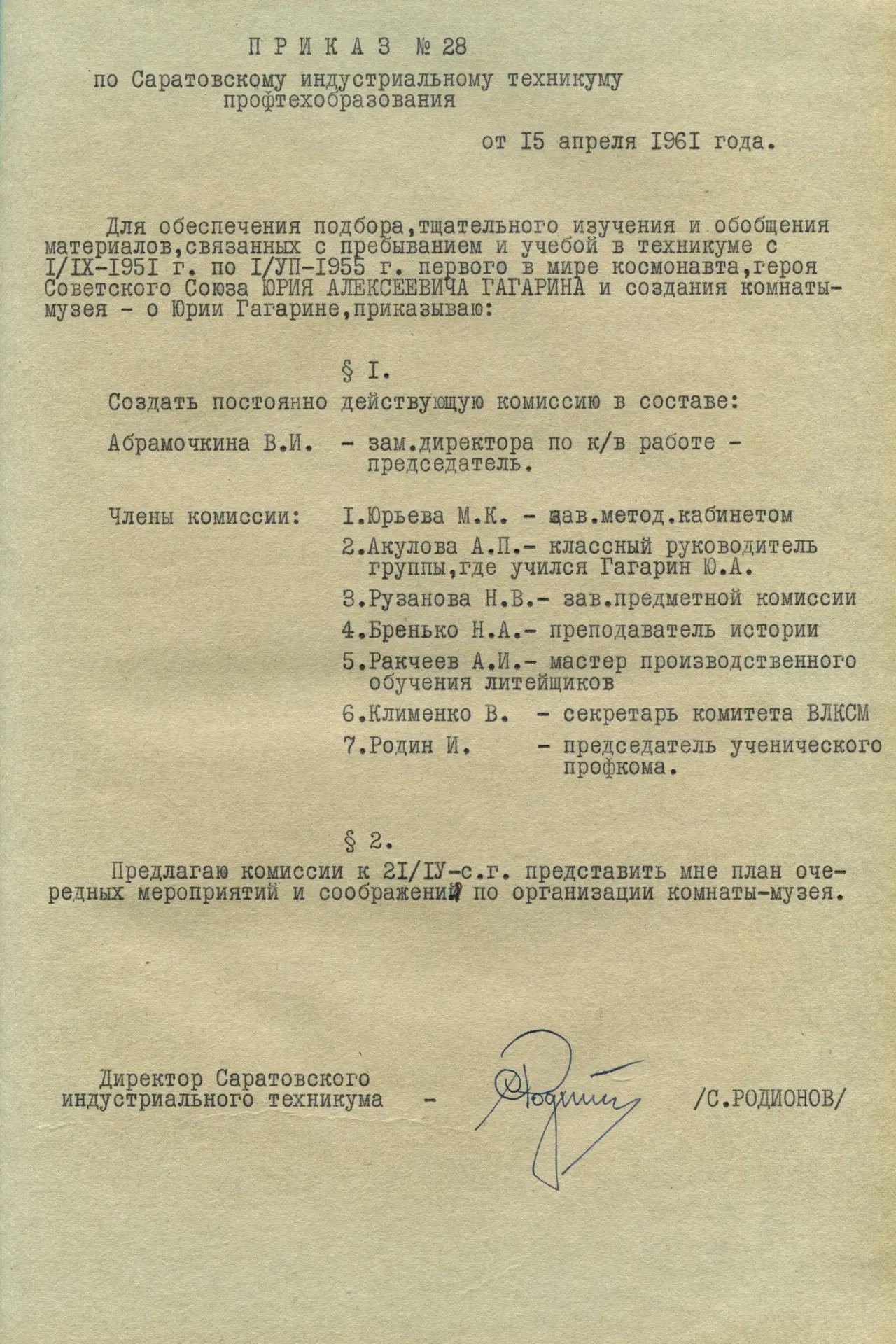 Всё началось после легендарного полёта. 12 апреля 1961 года, когда весь мир узнал, что первый космонавт Вселенной окончил Саратовский индустриальный техникум, в учебное заведение стали приходить горожане и журналисты. Они просили: «Дайте что-нибудь, что напоминает о Гагарине». Уже 15 апреля директор техникума Сергей Иванович Родионов издал приказ № 28. В нём говорилось о необходимости подбора, изучения и обобщения материалов, связанных с пребыванием и учёбой Юрия Алексеевича в техникуме с 1 сентября 1951 года по 1 июля 1955 года, а также о создании комнаты-музея Ю.А. Гагарина. Именно поэтому 15 апреля считается днём основания музея.