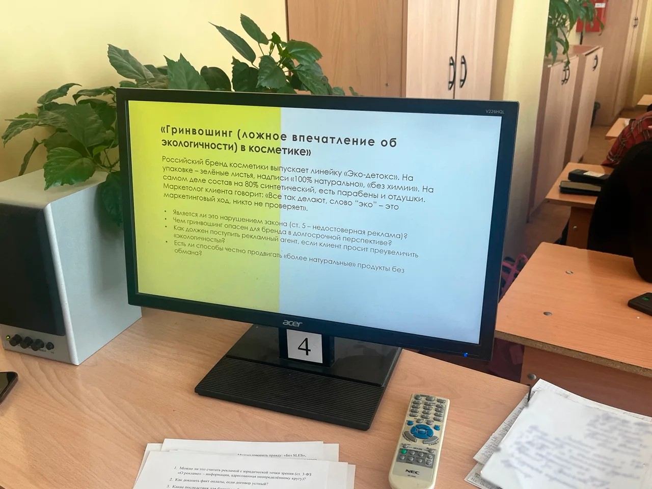В формате модерируемого обсуждения с элементами дебатов первокурсники разбирали реальные кейсы с гендерными стереотипами в наружной рекламе, скрытую рекламу у блогеров, гринвошинг в косметике. Каждая команда защищала свою позицию: от «приоритета бизнеса» до «строгих этических ограничений». Спорили аргументированно, ссылались на закон и примеры из практики.